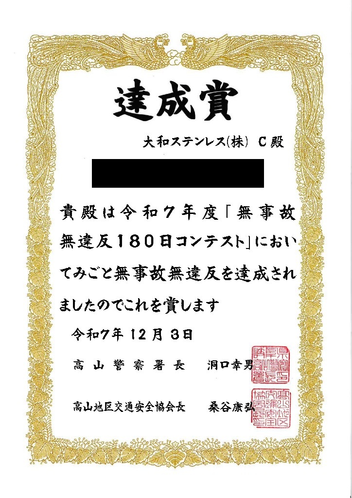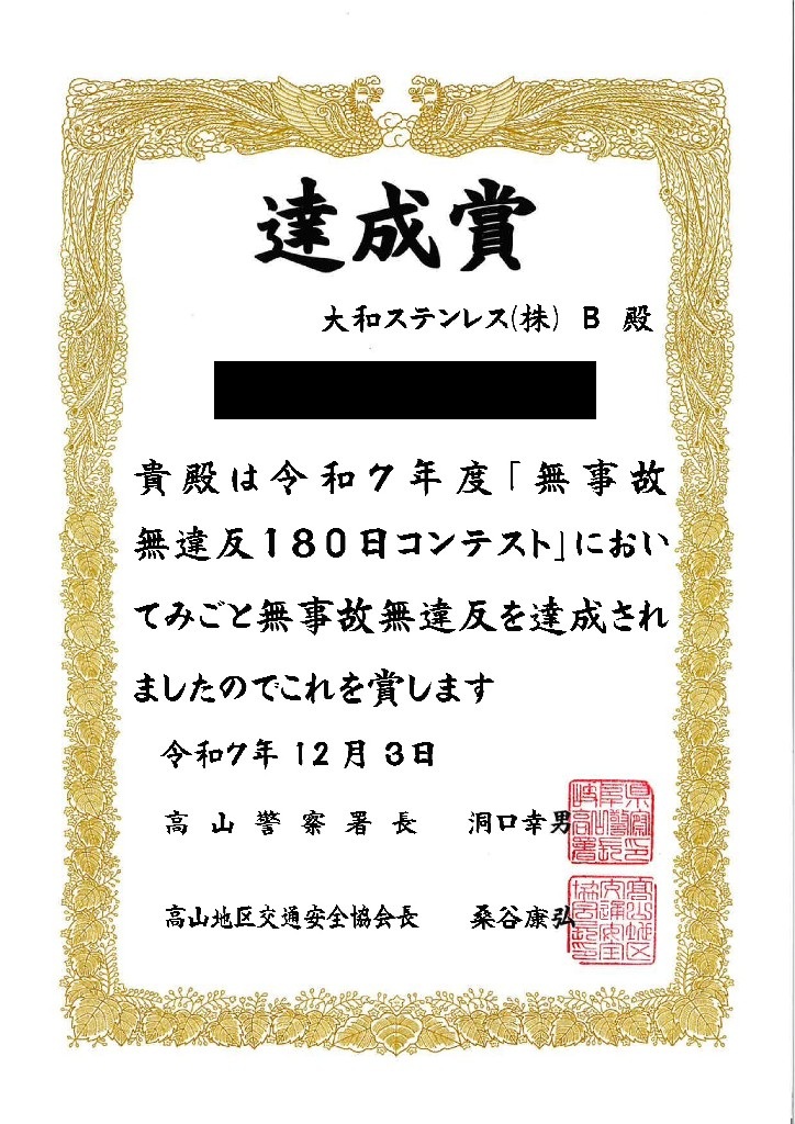 毎年参加している、高山地区交通安全協会が主催する「無事故無違反180日コンテスト」に